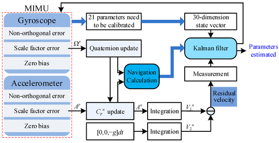 Step 4: Parameters’ estimation. The Kalman filter is employed to estimate a 30-dimensional state vector based on the previously obtained residual velocity; this state vector contains 21 parameters targeted for calibration.