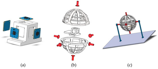 Spherical rotating platform: (a) scheme of designed MIMU; (b) spherical platform; (c) installation of spherical platform.
