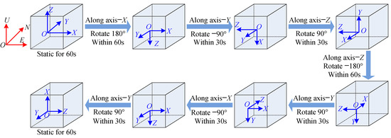 The oriented rotation steps are set as follows: first, the initial position of the MIMU platform is aligned for East–North–Up (ENU) directions. Remain stationary for 60 s, → rotate along axis-X at 180° for 60 s → rotate along axis-Y at −90° for 30 s → rotate along axis-Z at 90° for 30 s → rotate along axis-Z at −180° for 60 s → rotate along axis-Y at 90° for 30 s → rotate along axis-X at −90° for 30 s → rotate along axis-Y at 90° for 30 s → remain stationary for 60 s. (As for the counterclockwise rotation, the rotation degree is positive. And as for the clockwise rotation, the rotation degree is negative.) The total oriented rotation for the calibration will last for 390 s.