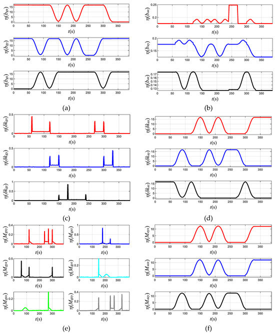 Figure 5d shows that the observability of scale factor errors δkax, δkay, and δkaz for accelerometers appears high and low in sequence, and the highest value can reach 16, which indicates that they are fully observable.