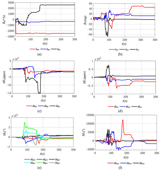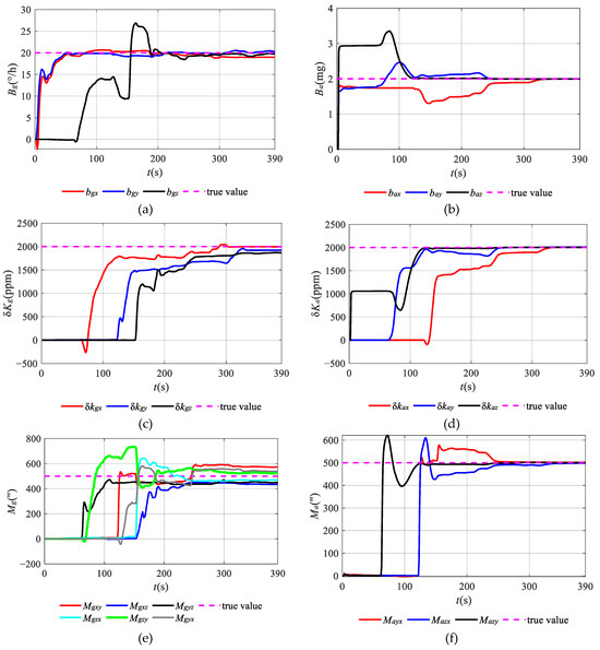 Figure 6a shows that after 180 s, the estimated curves of bgx, bgy, and bgz for gyroscopes gradually converge to the set values. Figure 6b shows that the estimated curves of bay and baz for accelerometer firstly converge to the set values, and then the estimated curve of bax converges after 240 s. Since the observability of bax, bay, and baz is relatively low, they need more time for the estimation. Figure 6c shows that the estimated curves of δkgx, δkgy, and δkgz for gyroscopes gradually converge to the set values after 300 s, 330 s, and 240 s, respectively. In Figure 6d, the estimated curves of δkax, δkay, and δkaz for accelerometers gradually converge to the set values after 330 s, 240 s, and 120 s, respectively. As shown in Figure 6e, the estimated curves of Mgxy, Mgxz, Mgyx, Mgyz, Mgzx, and Mgzy for gyroscopes converge to the set values after 300 s, 240 s, 300 s, 240 s, 270 s, and 330 s, respectively. In Figure 6f, the estimated curves of Mayx, Mazx, and Mazy for accelerometers gradually converge to the set values after 330 s, 330 s, and 270 s, respectively. The larger the observability, the less time there is for the estimation of the parameters. The total estimation time is about 390 s.