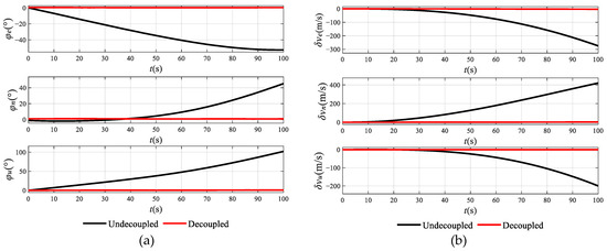 Figure 10 shows that the attitude error, velocity error, and position error are retrained effectively after decoupling in the static navigation calculation. Before decoupling the output of the MIMU, the maintain time is about 19.2 s for the total position error of 100 m; thus, the position drift per unit time is about 5.028 m/s. However, after decoupling the output of the MIMU, the maintain time is about 88.3 s for the total position errors of 100 m; thus, the position drift per unit time is about 1.132 m/s. The relative position drift rate has improved by 78.26%. It has greatly retrained the accumulative error rate of inertial navigation.
