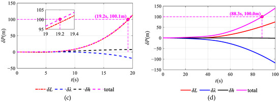 Comparison of the static navigation results before and after decoupling: (a) attitude error for static navigation calculation; (b) velocity error for static navigation calculation; (c) position error in static navigation calculation before decoupling; (d) position error in static navigation calculation after decoupling.