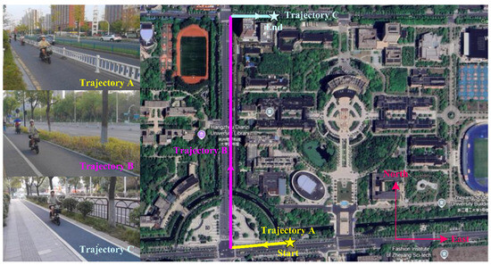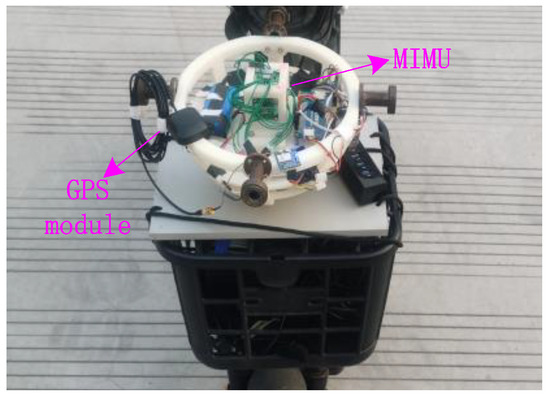 (2) As for the dynamic scenarios experiment, the MIMU is mounted on the front platform of the vehicle, as shown in Figure 11. The vehicle’s trajectory is constrained to the road, as depicted in Figure 12.