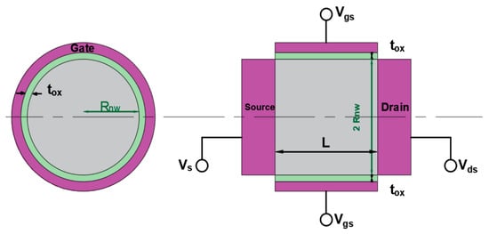 Figure 1 presents the geometric configuration of a cylindrical NWFET, which is similar to an MOSFET design. However, in the NWFET’s structure, a semiconductor nanowire replaces the conductive channel typically found in an MOSFET.