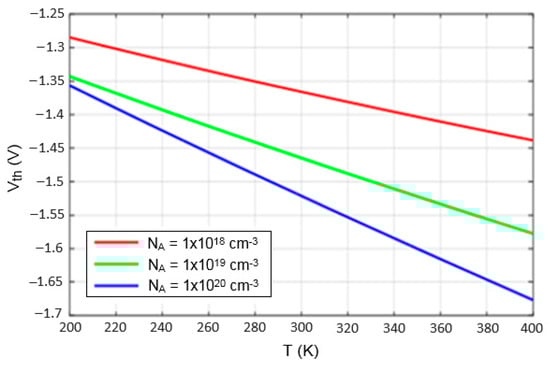 Considering a Si-based NWFET with a channel length of 20 nm, the temperature dependence of the threshold voltage is shown in Figure 3 for three different acceptor-doping concentrations. During the simulations, a metal work function of 5 eV was assumed. As we can see, for temperatures rising from 200 K to 400 K,  goes down, showing a temperature dependence due to the increase in the intrinsic carrier concentration. Higher doping levels determine a more negative  because of the enhanced built-in potential and the larger depletion region. This illustrates that dopant impurities and temperature both have a pronounced effect on the threshold voltage, as well as on the leakage currents and stability of the device.