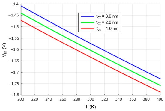 Notably, Figure 5 shows that, for a rising temperature,  was reduced independently of the oxide thickness due to the increased internal carrier concentration, which reduces the gate voltage required for switching on the device. A thin oxide ( = 1 nm) results in a more negative  due to a higher gate capacitance and better electrostatic control of the channel. In contrast, a thick oxide can lead to weaker control by the gate. The obtained results emphasize the importance of increasing the electrostatic control by reducing the short-channel effects and reducing the oxide thickness to improve the NWFET’s performance.