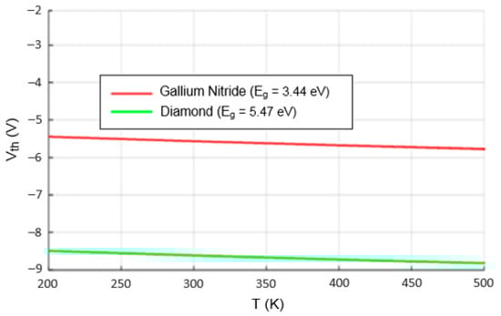 Figure 6 shows the ’s dependency on  for wide-bandgap materials, for example, gallium nitride (Eg = 3.44 eV) and diamond (Eg = 5.47 eV). As we can see, with a temperature variation from 200 K to 500 K,  decreased slightly. These behaviors can be attributed to thermal dependencies, such as the increasing intrinsic carrier concentration and the bandgap-narrowing effect, which indicate that semiconductors with larger bandgaps produce significantly fewer intrinsic carriers and, therefore, display a superior threshold voltage with an increased stability. Also, this result indicates that wide-bandgap semiconductors are less susceptible to leakage caused by temperature and are, thus, suitable for high-power and high-temperature applications.