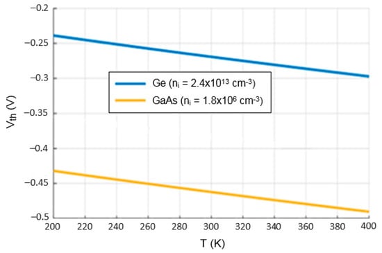 On the other hand, Figure 7 shows the variation in  with temperature for conventional semiconductors such as Ge (Eg = 0.66 eV) and GaAs (Eg = 1.43 eV). When compared with Si (Eg = 1.12 eV and  = 1.5 × 1010 cm−3), the Ge’s behavior is linked to the lower bandgap and the higher intrinsic carrier concentration, which reduce the built-in potential, thus resulting in a less negative . In fact, at T = 300 K, Ge has a higher  (2.4 × 1013 cm−3) than Si, which makes it intrinsically more conductive, leading to undesired leakage currents. Also, by considering the relative permittivity of materials (i.e., 11.7 for Si and 16 for Ge), we must also consider that the higher relative permittivity affects the gate capacitance of the nanowire as well. Similarly, the GaAs’s behavior is mainly determined by a relative permittivity of 12.9, although it presents an extremely low = 1.8 × 106 cm−3, which assures poor thermal generation of carriers.