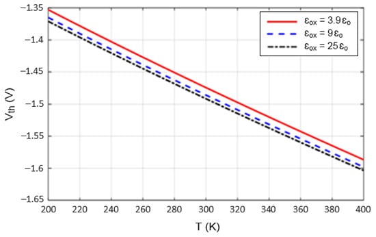 As we can see,  appears to be only slightly dependent on this parameter, although when the temperature increases,  decreased for all cases as a consequence of the  increase and bandgap narrowing, which reduce the required gate voltage to turn on the device. However, a higher oxide permittivity tends to enhance the gate capacitance, leading to a slightly more negative value of .