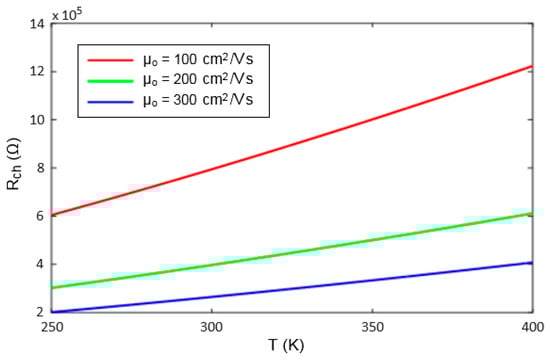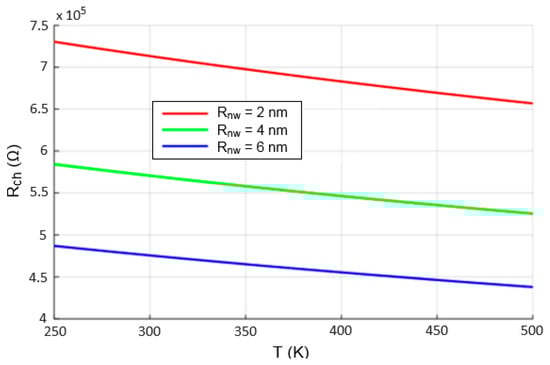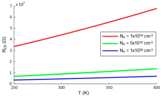 The channel resistance behaviors, as a function of temperature for different semiconductor doping levels, are shown in Figure 10. A carrier mobility reference value of µo = 100 cm2/Vs was assumed. As the temperature increased,  increased. This result is expected due to increased phonon scattering at higher temperatures, which reduces the carrier mobility. Also, the resistance was highest for the lowest doping level, and it decreased as the doping increased. Notably, we can state that higher doping concentrations not only reduce resistance, by increasing the carrier concentration, but also compensate for the mobility degradation due to the temperature. This appears to be a key finding for building effective NWFETs, particularly for applications involving high temperatures.