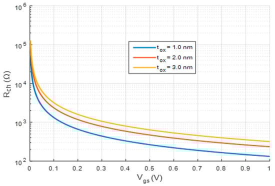 The dependence of the NWFET’s channel resistance on the gate-bias voltage, Vgs, for different design parameters, namely, the nanowire radius, channel length, and oxide thickness, is shown in detail in Figure 15, Figure 16 and Figure 17. From Figure 15, we can see that  decreased steeply as Vgs increased, indicating an enhanced electrostatic gating that induces a stronger inversion layer, thereby increasing the carrier density and lowering the resistance. In particular, from Figure 15, smaller nanowires exhibit a higher channel resistance due to a stronger quantum confinement, which limits the number of conducting subbands and suppresses the carrier mobility. In contrast, a wider nanowire (6 nm) benefits from reduced quantum effects and support higher carrier transport. This has a direct impact on the NWFET performance. In fact, devices with a larger radius offer lower resistance and a higher drive current, enhancing speed and transconductance, while a smaller radius, although better at controlling short-channel effects, suffer from a limited current drive and an increased delay due to the higher channel resistance.