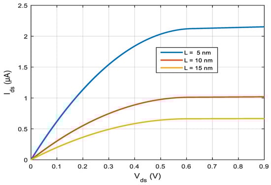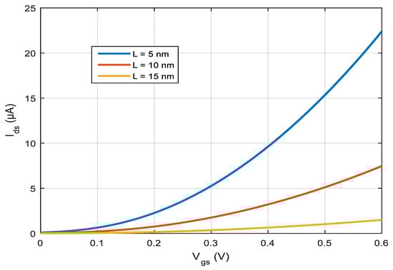 From Figure 19, we can clearly see that as the channel length decreased, the drain current significantly increased for a given gate voltage. This is a direct consequence of a reduced channel resistance and an improved carrier transport efficiency in shorter channels. At shorter lengths, carriers experience less scattering and shorter transit times, enabling a higher current flow. Moreover, the steeper subthreshold slope and rapid current increase in shorter channels suggest stronger gate control and higher transconductance. However, the increased Ids for L = 5 nm may also indicate the influence of short-channel effects, such as threshold voltage roll-off and DIBL, which become prominent as the electrostatic control of the gate weaken with an aggressive device scaling.