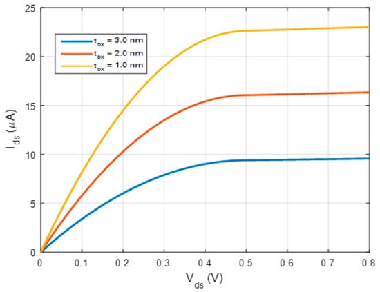 Ids–Vds curves for different values of the oxide thickness. Vgs = 0.6 V.