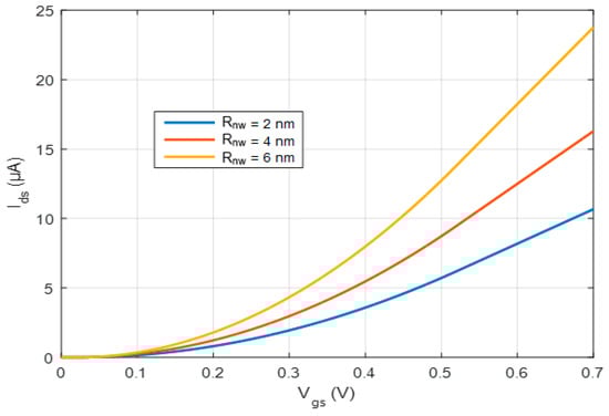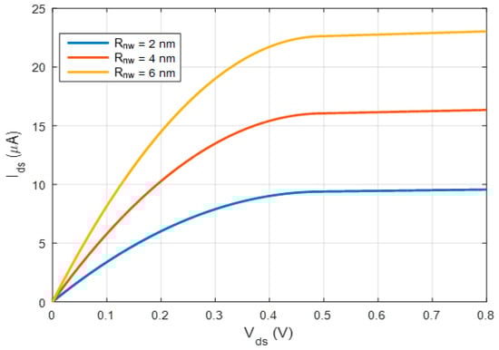 Finally, Figure 22 and Figure 23 show the effect of a different nanowire radius. In particular, as Rnw increased, the drain current significantly increased for all investigated Vds (Figure 22). This behavior can be physically attributed to the enlarged cross-sectional area of the channel, which reduces the channel resistance and allows for more carriers to flow. A larger radius also accommodates a greater inversion charge due to the increased volume, enhancing the current drive. However, larger nanowire diameters can potentially degrade the electrostatic gate control, possibly due to a strong gate coupling or high-k dielectrics, as assumed in the simulations. All curves show typical transistor behavior with linear and saturation regions, and the saturation current increased with the radius.