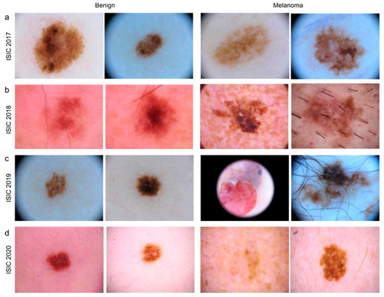 Examples of dermoscopy image datasets provided by The International Skin Imaging Collaboration (ISIC) (a) ISIC 2017, (b) ISIC 2018, (c) ISIC 2017, (d) ISIC 2020.