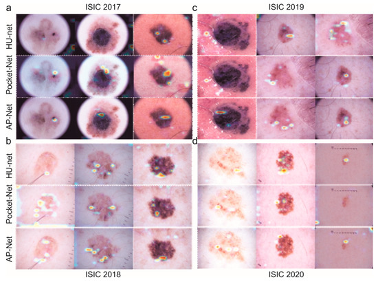 Grad-CAM visualization of APNet predictions on dermoscopic images. The highlighted regions indicate areas of the lesion that contributed most to the model’s classification. (a) ISIC 2017, (b) ISIC 2018, (c) ISIC 2017, (d) ISIC 2020.