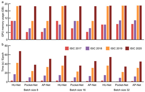 The network parameters are reduced from 1,304,866 (HU-Net) to 70,114 (Pocket-Net) and 70,762 (APNet), resulting in both Pocket-Net and APNet having fewer parameters and thereby requiring less computation during both training and inference. This can lead to faster training times and lower inference latency, which is beneficial for real-time applications and resource-constrained environments. As shown in Figure 5, these models also consume less memory, which is crucial for deployment on devices with limited memory resources, such as mobile phones and micro-controllers. However, reducing the number of parameters in these models led to a loss of performance, limiting the model’s ability to capture fine-grained features in the data. Figure 5a compares training speed and memory usage of the original HU-Net structure and Pocket-Net and APNet for different batch sizes. Pocket-Net sped up training time for ISIC 2017, 2018, 2019, and 2020 datasets by 40% on average. Increasing batch size is a straightforward way to boost GPU speed, but is not always successful. Also, bigger batch sizes computed in parallel on the GPU means the batch size can be large as long as there is enough GPU memory. Figure 5b demonstrates the effect of batch sizes and architecture on memory usage.