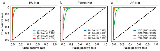 ROC curve of (a) HU-Net, (b) Pocket-Net, and (c) and APNet. The dashed black line represents the line of no discrimination.