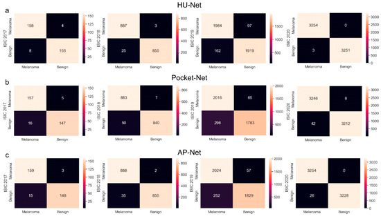 Confusion Matrix of (a) HU-Net, (b) Pocket-Net, and (c) AP-Net for the four datasets.