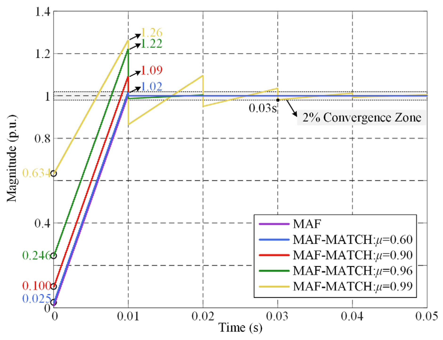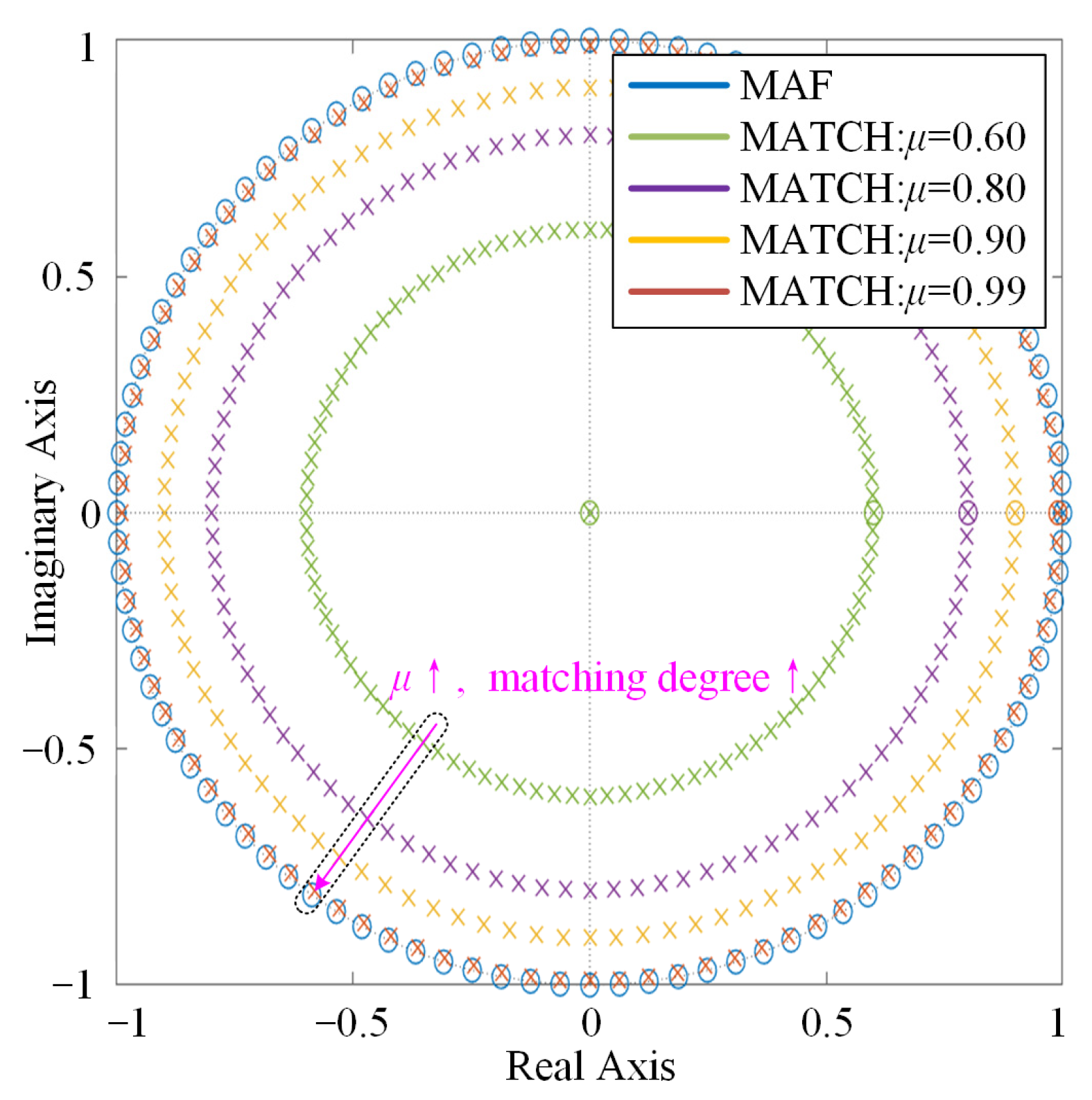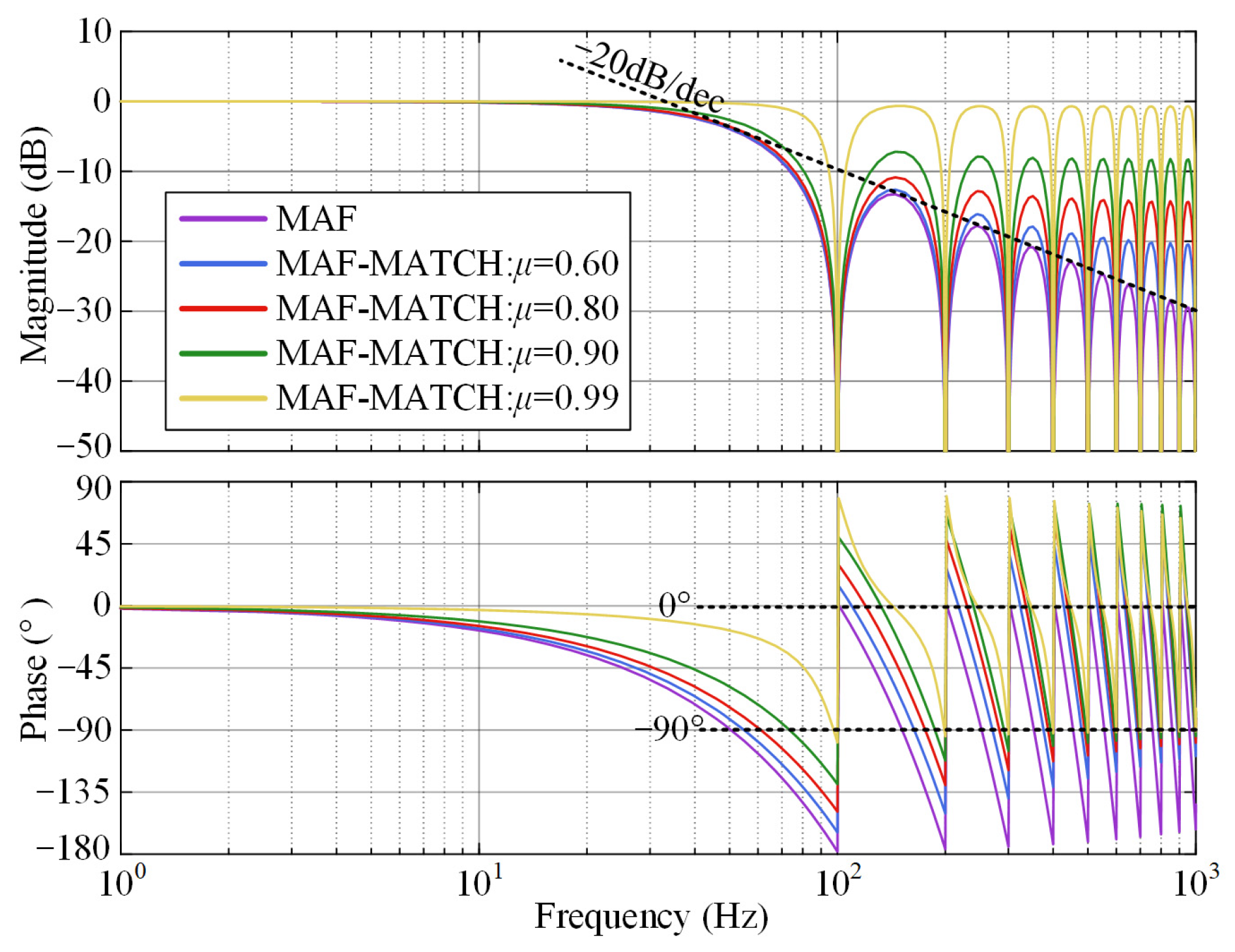 - The zero-pole characteristics of the conventional MAF are analyzed, revealing the limitations caused by mid- and high-frequency attenuation in dynamic performance. A cascaded filter model is then constructed by integrating MAF with a zero-pole matcher (MATCH), enabling frequency-domain compensation to retain harmonic suppression capability while improving response speed.