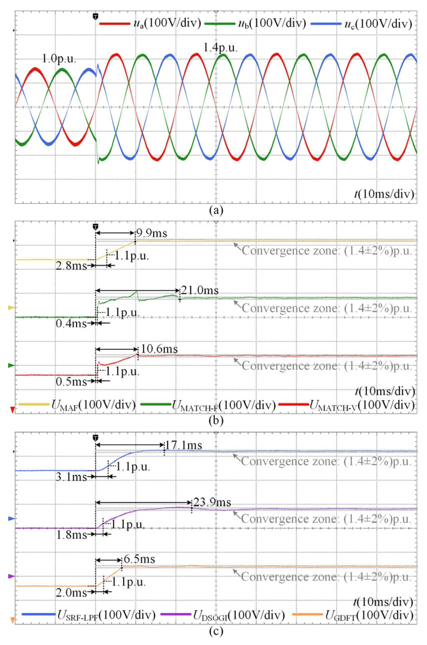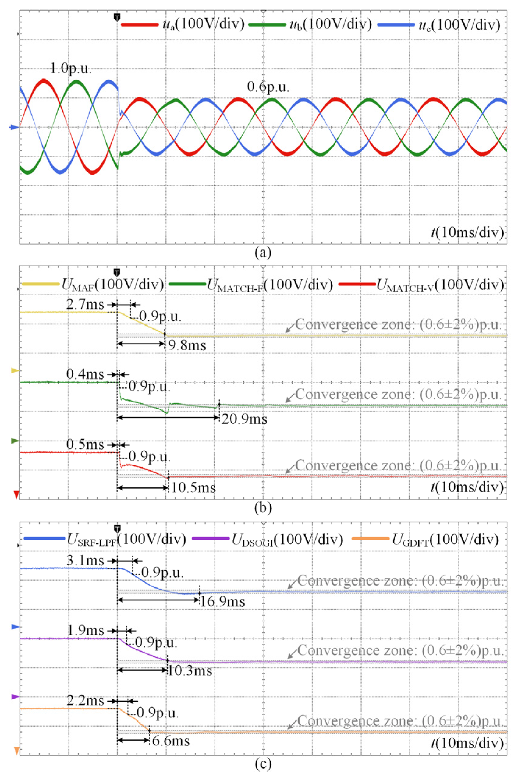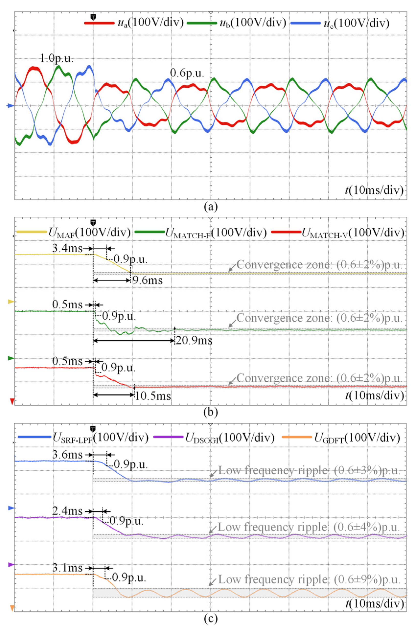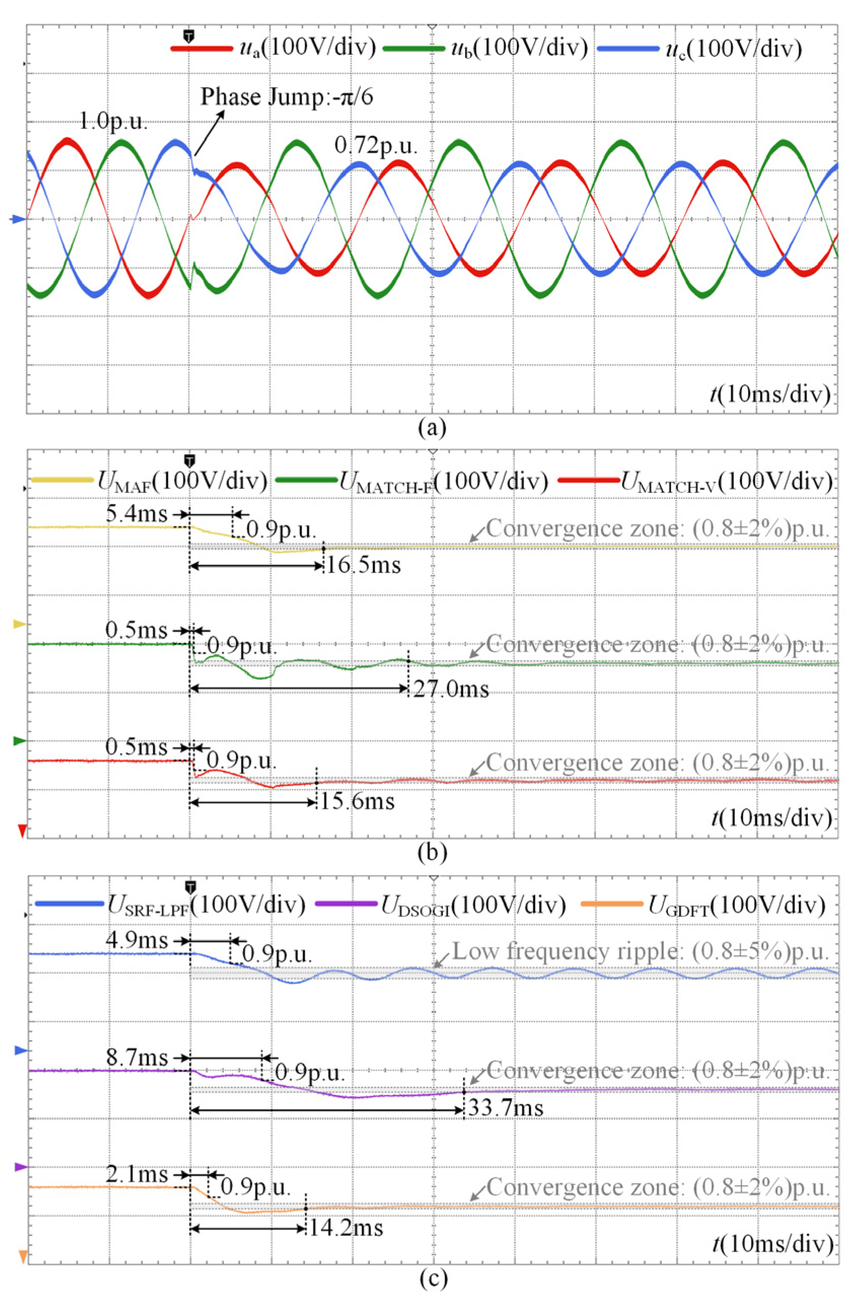 - Comprehensive tests under various non-ideal grid conditions—including symmetrical sags/swells, phase jumps, asymmetrical sags, and harmonic distortions—are conducted. Comparisons with conventional methods such as SRF-LPF, DSOGI, and GDFT demonstrate that the proposed method delivers superior overall performance in terms of recognition speed, convergence accuracy, and disturbance immunity.