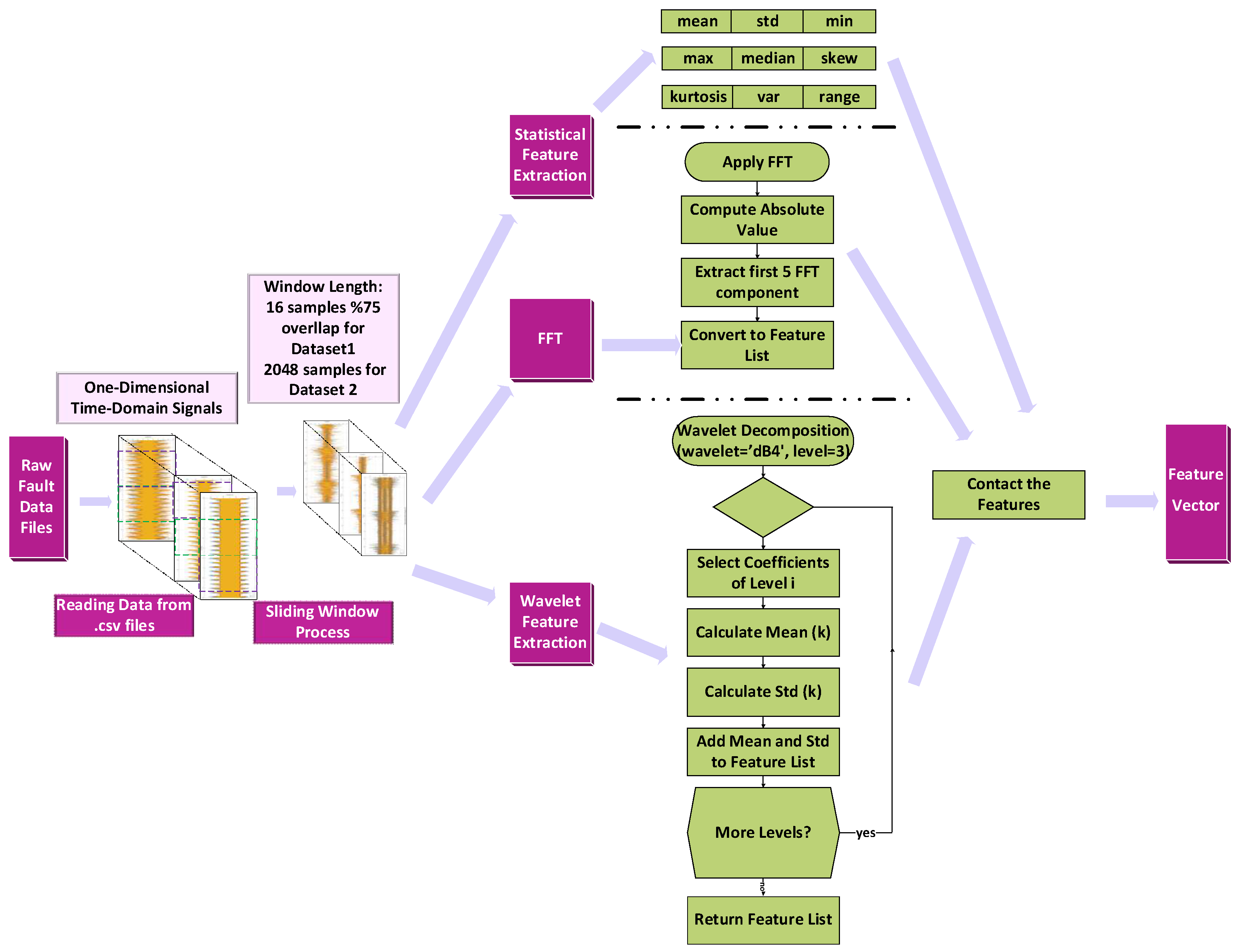 | Time–Frequency Domain | DWT (Daubechies 4, 3-level decomposition) | Mean and standard deviation of approximation and detail coefficients. | Enhances non-stationary fault detection by preserving both transient and steady-state features, allowing fault signatures to be localized on both time and frequency scales. |