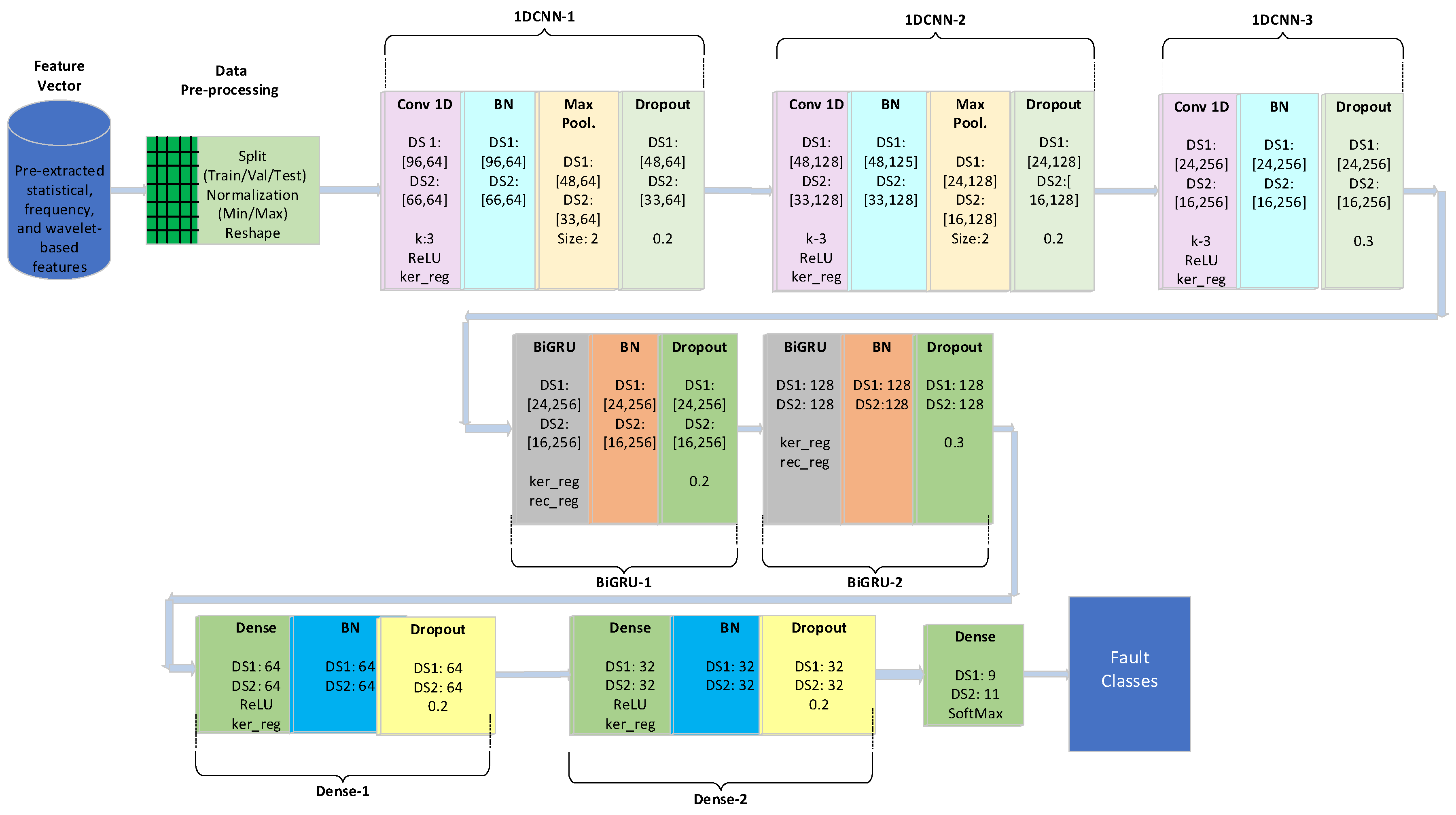 | Proposed Model | 1DCNN–BiGRU | Statistical analysis, FFT, and DWT | 1 healthy + 10 faulty | 60/20/20 | Yes | ACC: 99.98% Precision (W/M): 99.98% Sensitivity (W/M): 99.98% F1-Score (W/M): 99.98 Specificity (W): 99.98% Specificity (M): 99.99% AUC (W/M): 100% Cohen’s Kappa: 1.00 Inf. Time: 0.2 ms/sample Train. Time: 485.92 s |