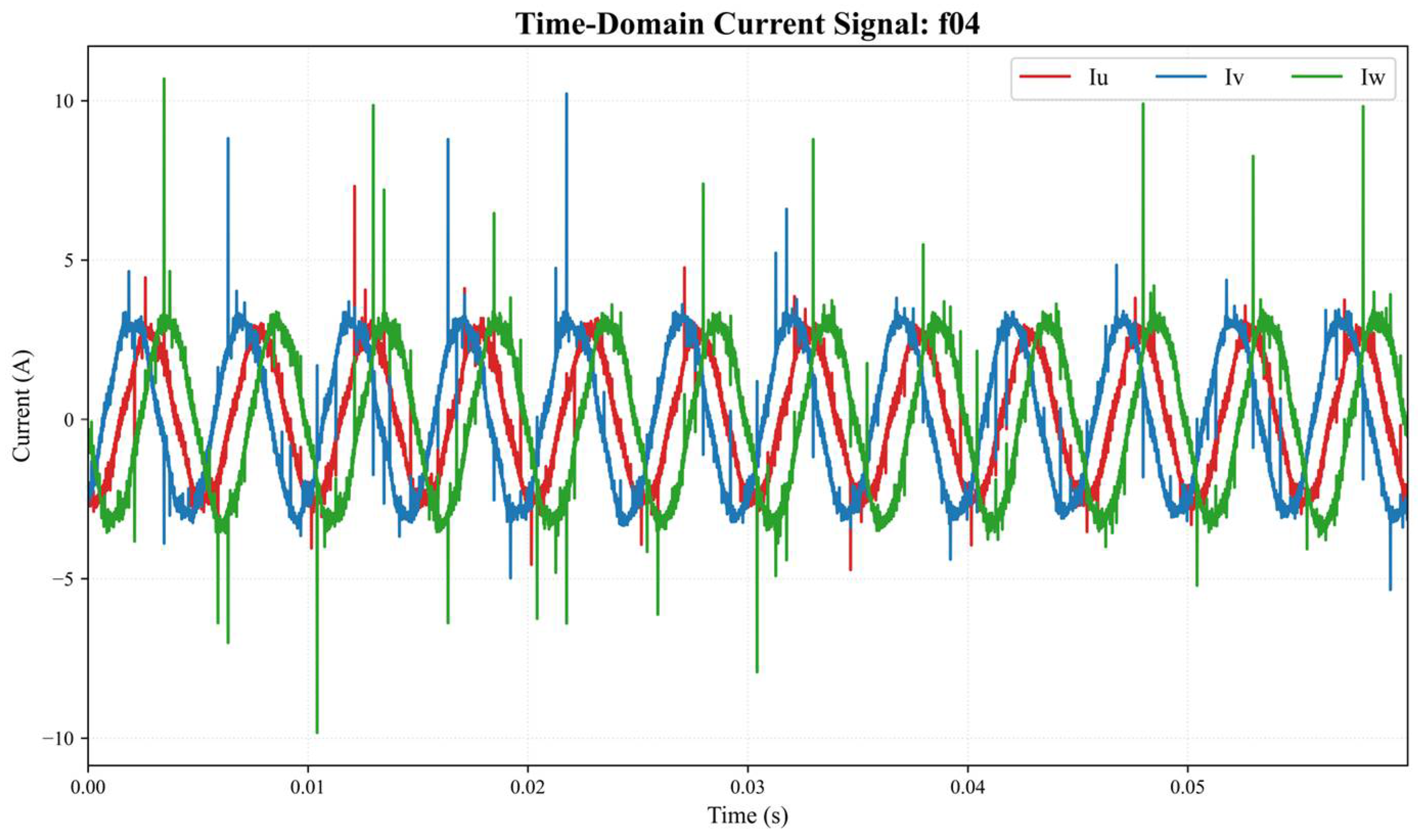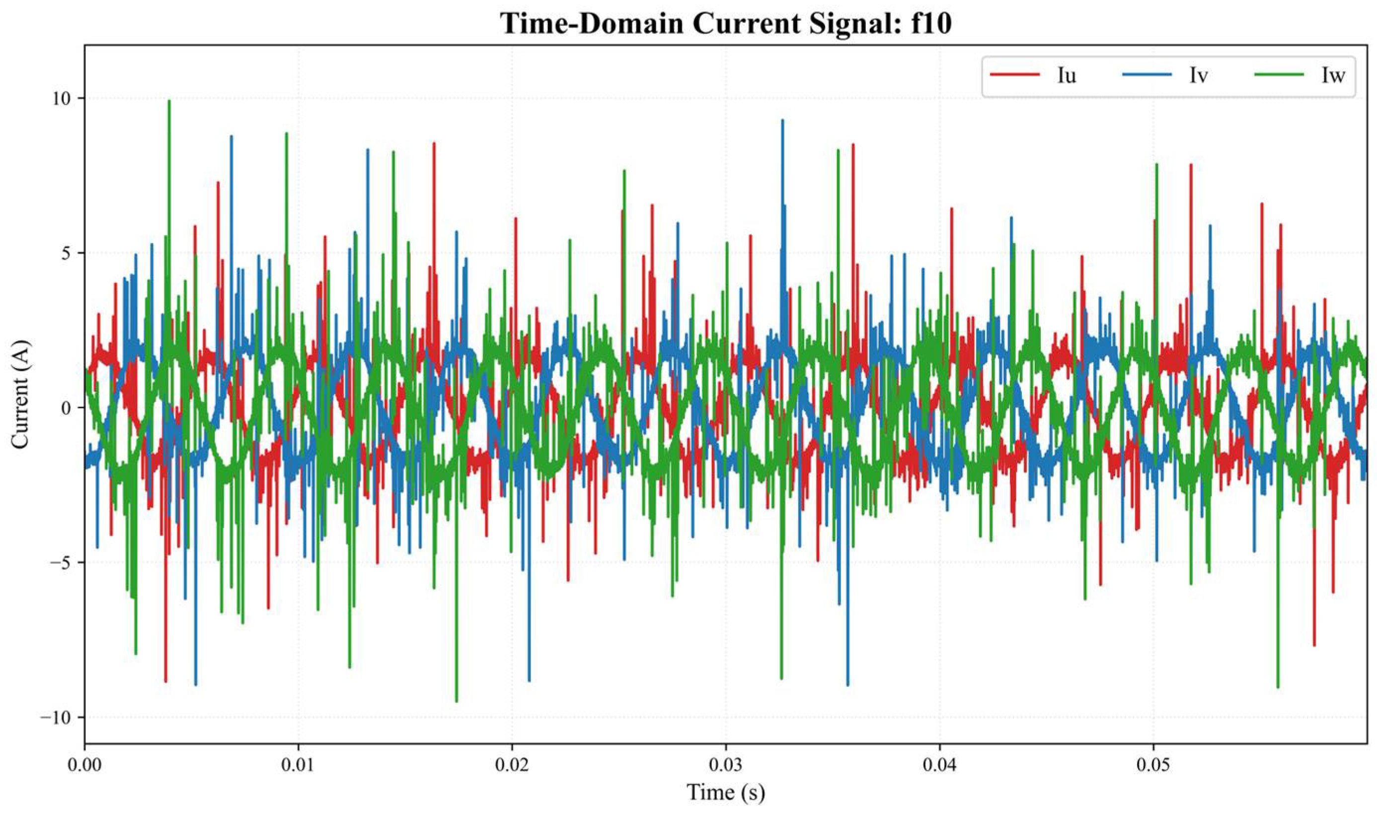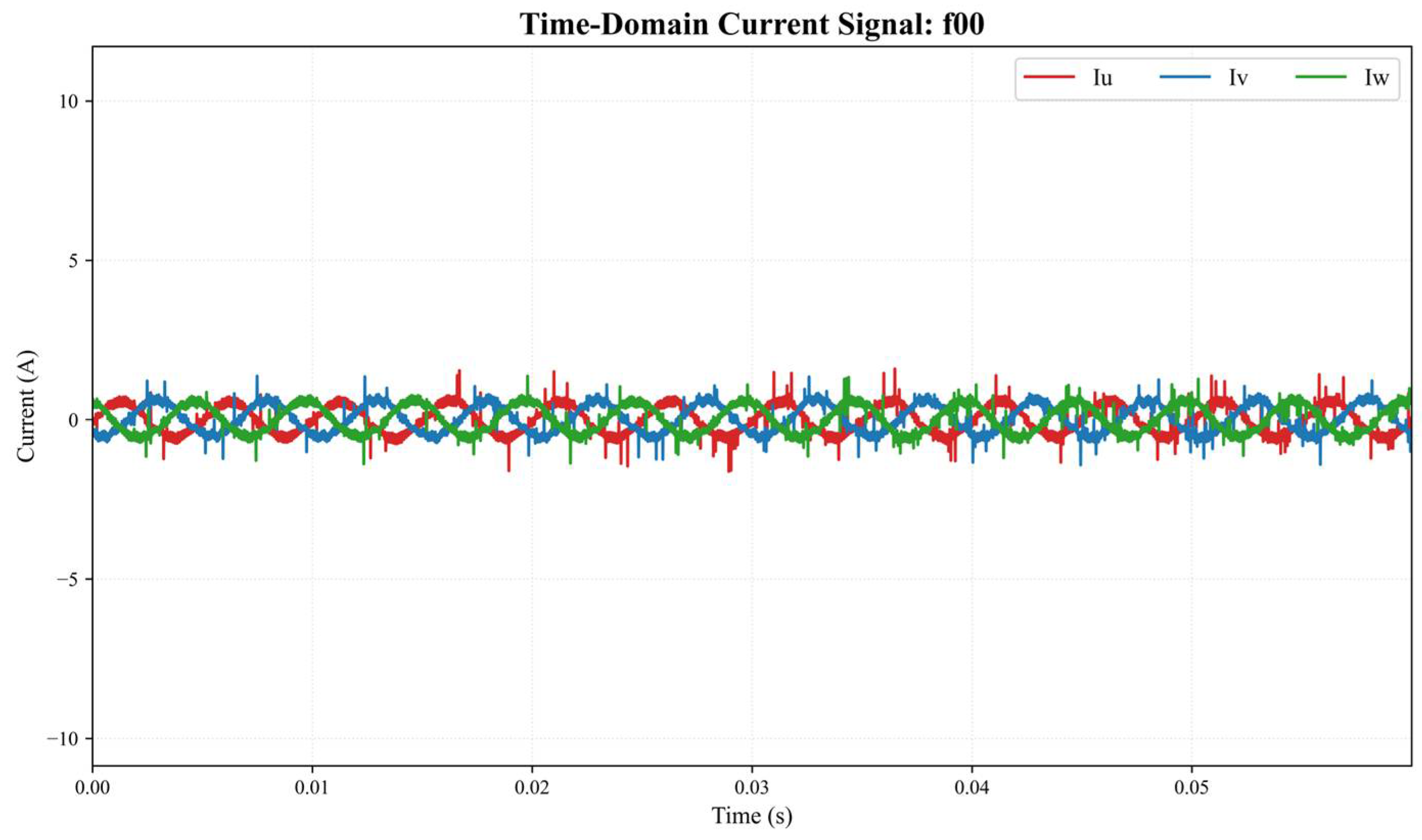 - To comprehensively evaluate the effectiveness of the proposed model, it is initially applied to two distinct datasets that represent different failure types and the data collection process: (i) real-world operating measurements collected from an inverter-driven PMSM system combining current, voltage, and temperature values [43]; (ii) PMSM stator fault data containing inter-coil and inter-turn short-circuit faults (ITSCFs) acquired under varying power levels [46].