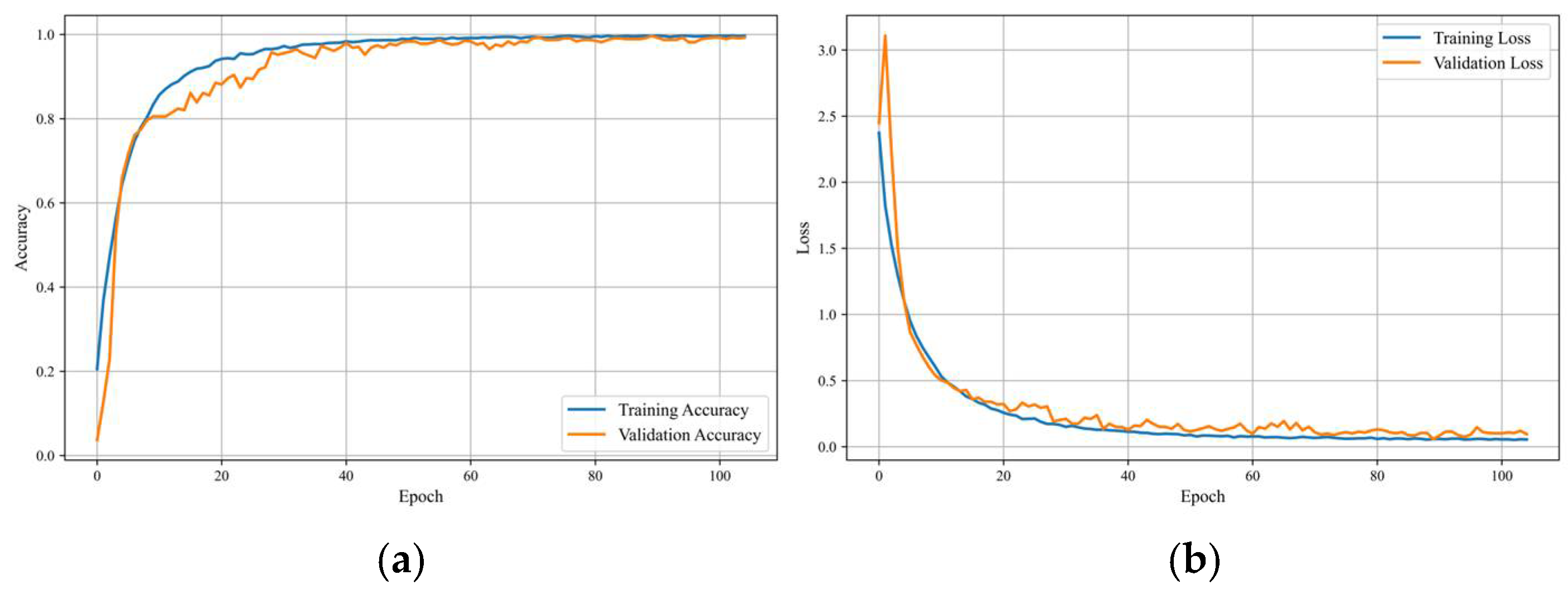 - With the addition of L1–L2 regularization, adaptive dropout, and batch normalization, the proposed hybrid 1DCNN–BiGRU model achieved high diagnostic accuracy for faults across several classes. In contrast to previous research, the model exhibits better generalization despite the comparatively lengthy training period.