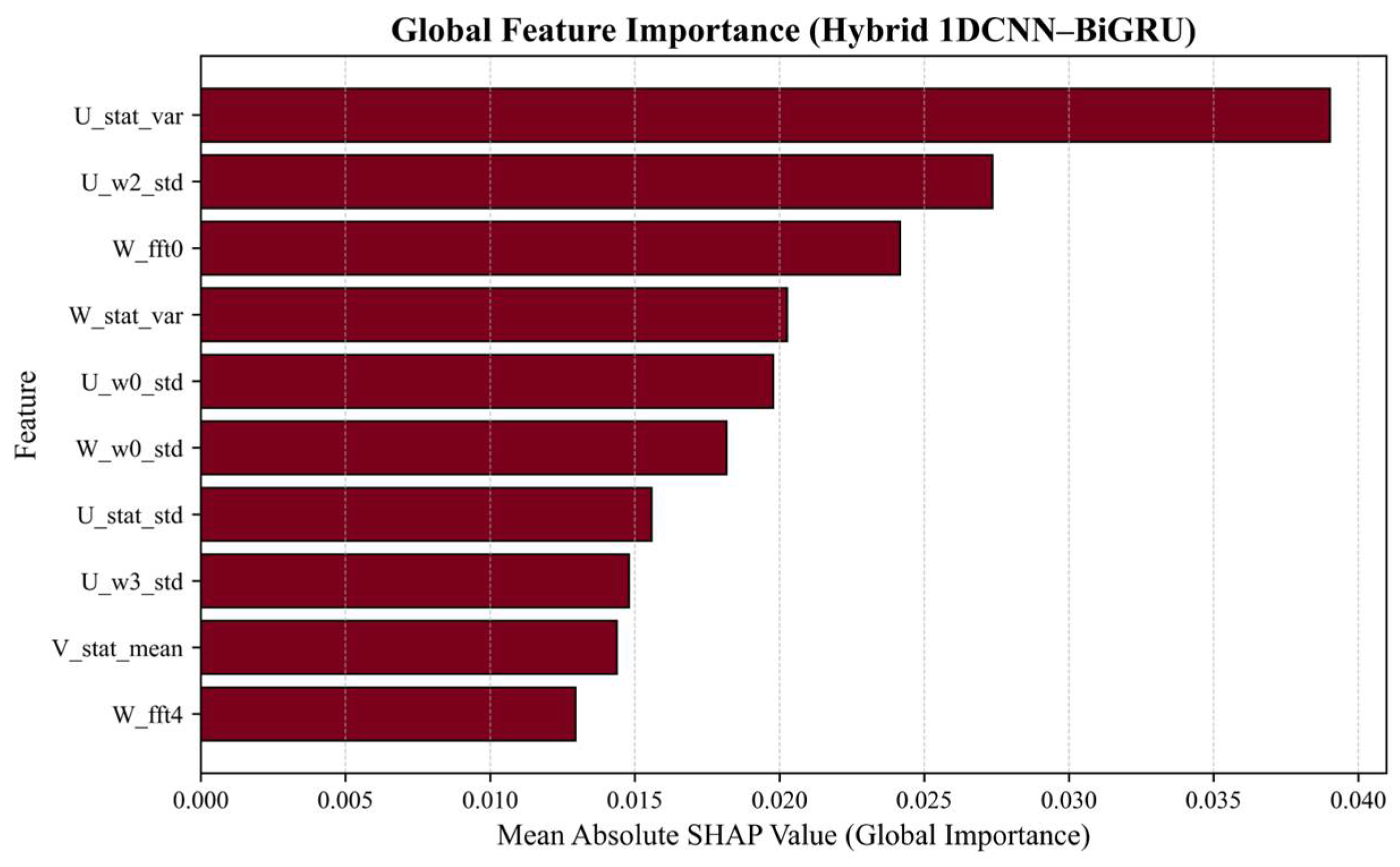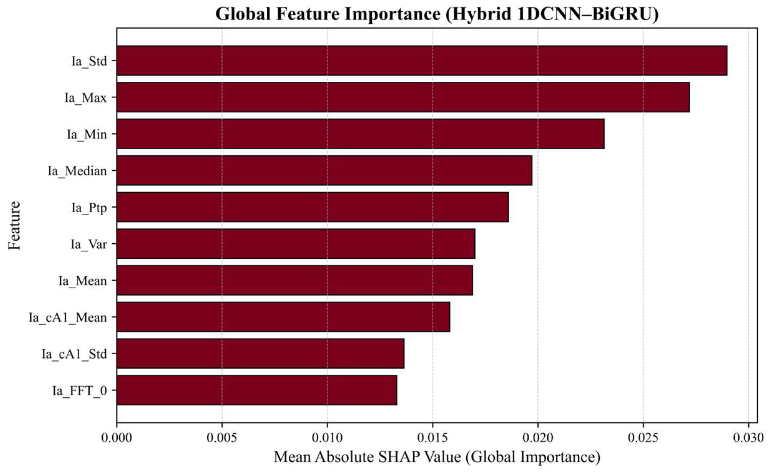 - To enhance interpretability, SHAP analysis was applied to the hybrid 1DCNN–BiGRU model to quantify the contribution of individual features to the model’s fault classification decisions.