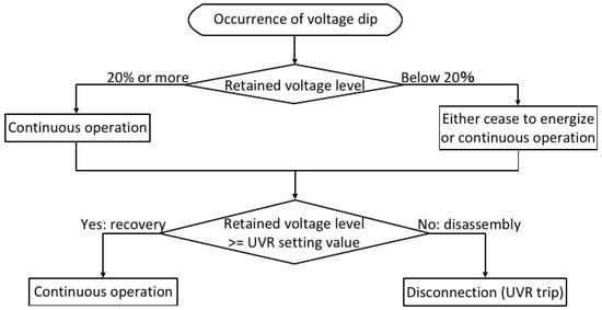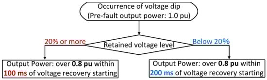In recent years, the deployment of renewable energy sources has expanded rapidly worldwide, with solar photovoltaic (PV) systems undergoing significant growth. According to the International Energy Agency (IEA), the share of renewable energy in global electricity generation is likely to increase from 30% in 2023 to 46% in 2030 [1]. The United States ranks among the top producers of solar electricity. There, small-scale PV systems account for approximately one-third of the total solar capacity, and nearly 70% of these installations are located in residential settings [2]. However, many small-scale PV systems inject power into the grid regardless of the demand conditions. This results in local voltage fluctuations and an imbalance between supply and demand [3]. To address such grid disturbances, Germany enacted the “Solar Peak Act” in February 2025. It imposes various operational constraints on PV systems. Similar policies are anticipated in other countries. As a countermeasure, Home Energy Management Systems (HEMSs) equipped with battery storage have gained attention as a means to stabilize residential power flow [4,5,6,7,8,9]. These systems can absorb surplus power and mitigate the reverse power flow by coordinating charge/discharge operations. Thereby, these support grid stability. For residential HEMSs applications, power conditioning systems (PCSs) are essential for bidirectional power conversion between batteries and the grid. In addition, owing to the installation space limitations, it is important to miniaturize the entire system [10,11]. These systems should be compact, efficient, and compliant with the grid interconnection standards. A critical requirement is fault ride-through (FRT). FRT is mandated in many countries to ensure grid stability during voltage disturbances [12,13]. Without FRT capabilities, the simultaneous disconnection or power reduction of distributed energy resources (DERs) during large-scale voltage dips or frequency deviations (such as those caused by transmission faults or generation outages) can result in subsequent failures throughout the power system. To prevent such instabilities, FRT requirements mandate that grid-connected systems maintain their operations during temporary disturbances. In Japan, the national Grid-interconnection Code mandates that DERs remain connected for at least 1.0 s following the onset of a voltage dip until the under-voltage relay (UVR) is permitted to activate [14]. Figure 1 outlines the FRT timing requirements for the voltage dip. Although, systems may continue operation or cease energization during the fault, these should not disconnect before this duration. The post-fault response also varies depending on the retained voltage level. Figure 2 illustrates the output power recovery requirements. For retained voltages of at least 20%, the system should recover at least 80% of the pre-fault output within 0.1 s after voltage restoration. For retained voltages below 20%, the output should recover to at least 80% of the pre-fault value within 0.2 s after voltage restoration. These requirements impose stringent constraints on PCS design, particularly under transient operating conditions.