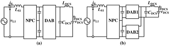 Schematic diagram of power circuit: (a) power circuit consisting of a conventional DAB converter, (b) power circuit consisting of IPOS-DAB converter.
