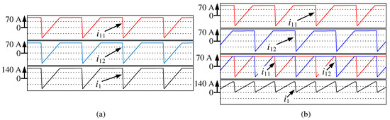 Primary-side current waveforms of the DAB converters: (a) without interleaving, (b) with interleaving ( phase shift).