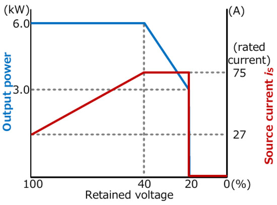 Here, represents the DC-side power supplied from the DAB converter, denotes the AC-side power injected into the grid, and represents the power stored or released in the DC-link capacitor. Under normal operation, holds, and the DC-link voltage remains nearly constant. However, during a voltage dip, decreases and the balance is disturbed, causing to fluctuate and the capacitor voltage to rise. One possible approach is to directly control the inverter output current; however, such a method requires coordination between the output current of inverter and the DC-link voltage regulation, resulting in a more complex control structure. Therefore, this study adopts a simplified configuration in which the system operation is achieved only by two control loops: the DC-link voltage control and the DC-side output power control of the DAB converter. This approach enables the proposed system to achieve FRT compliance while maximizing the inverter output power without exceeding the rated current of the switching devices even under voltage dip conditions. The rated current capacity of the switching devices used in the inverter should be considered when designing an output power control strategy that satisfies the FRT requirements without exceeding the device limitations. In this system, an Si-MOSFET (IXFK150N30P3) manufactured by IXYS is used as the switching device for the NPC inverter. Although the device has a continuous drain current rating of 150 A, practical operation typically requires a derating margin of approximately 70%. Accordingly, the upper limit of the inverter output current is set to 75 Arms. Based on this current limitation, the output power reference, , is reduced adaptively according to the voltage retained during a voltage dip. This ensures that the inverter output current does not exceed a safe operating range. As illustrated in Figure 7, when the retained voltage is above 40%, the corresponding current remains below the rated limit according to (1). Therefore, the output power can be maintained at the rated 6.0 kW without risking overcurrent. In the range of 20–40%, however, maintaining constant power would require a current exceeding 75 Arms. Thus, the reference power is reduced linearly so that the inverter output current remains within the safe operating limit. When the retained voltage decreases below 20%, is set to zero to fully suspend the power flow. This prevents overcurrent risk and ensures FRT compliance.