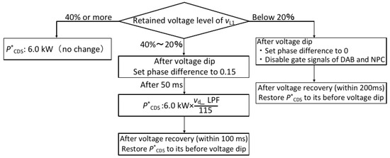 An overview of the control method of the IPOS DAB converter is presented in Section 2.2. However, a power control strategy is essential to satisfy the FRT requirements. This section explains the output power control method implemented in response to voltage dips in conjunction with the corresponding logic based on the retained voltage level. When a voltage dip occurs, maintaining a constant reference output power results in an increase in the inverter output current. The output power of the NPC inverter is the product of the output voltage and current , which can be expressed as