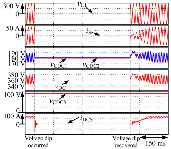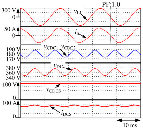 Figure 9 shows the simulation waveforms under normal grid voltage conditions, where the system provides a rated output power of 6.0 kW from the DC voltage source to the utility grid. At the top of Figure 9, is the grid voltage, is the source current, and are the capacitor voltages, is the DC-link voltage, is the battery voltage, and is the battery current. The current is a sinusoidal waveform with a unity power factor. Thus, the proposed PCS can inject active power from a battery. The capacitor voltages and are well balanced. This implies that the midpoint potential was stabilized. The DC-link voltage was maintained at approximately 360 V, and the voltage ripple was within 5%. This satisfied the design target. The DAB converter transmitted 6.0 kW from the battery to the DC-link capacitor. The power injected from the DC-link into the grid was approximately 5.71 kW.