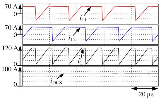The DAB converter controls the output power of the DC power source by adjusting the phase-shift angle between the primary and secondary sides. In this topology, the direction and magnitude of the power flow are controlled based on the phase difference between the square-wave voltages applied to the primary and secondary bridges. To implement this phase-shift modulation, monostable multivibrators were used to generate the gate signals for the four switching devices on each bridge. The instantaneous power flowing into or out of the DC source was calculated as the product of the DC-side current and voltage . This value was then passed through a digital low-pass filter to extract the average power components. The filtered signal was compared with the reference value, . The resulting error was processed using a PI controller. The controller output specified the phase shift applied to regulate the power flow of the DAB converter. In the IPOS DAB converter adopted in this system, the two DAB converters are connected in parallel on the primary side and driven by the same modulation signal to ensure equal power sharing. To reduce the ripple component of the DC-side current , an interleaving method was employed by shifting the carrier signals of the two DAB converters by one-fourth of the switching period (). This phase shift caused the high-frequency components of the DAB input currents and to partially cancel each other out, thereby reducing the ripple in their sum . Figure 6 illustrates the effect of the interleaved operation. The waveform in Figure 6 is drawn from Figure 4 and Figure 5, and Table 2. The control block in Figure 5 and circuit constants in Table 2 are explained in detail in the following sections. For clarity, the component values in Table 2 correspond to a 6 kW residential PCS designed for a switching frequency of 20.4 kHz and a DC-link voltage of 360 V, as detailed in Section 4. As shown in Figure 6a, both the DAB converters operate in phase. This results in synchronous switching that causes the individual input currents and to overlap. As a result, the sum exhibits a large ripple component. In contrast, Figure 6b shows that with interleaved driving, the carriers of the two DAB converters are phase-shifted by This causes and to partially cancel each other. This suppresses the ripple component in the combined current and increases its ripple frequency two-fold, thereby enabling the use of smaller LC filter components. This reduction in filter size contributes to the overall miniaturization of the system.