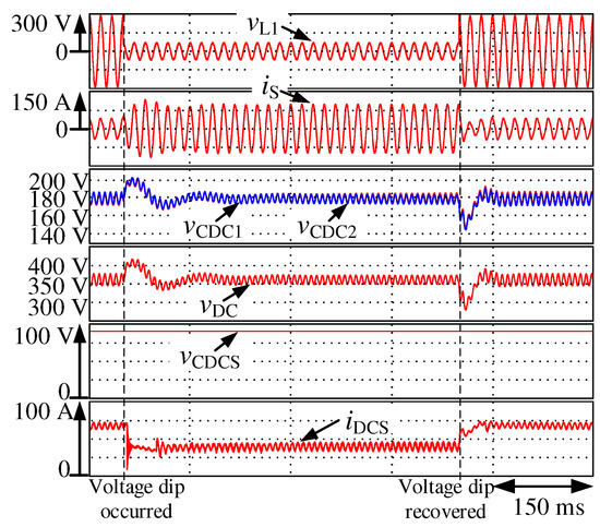 Figure 13 shows the simulation waveforms during a dip to 20% of the nominal grid voltage when the PCS provides a rated power of 6.0 kW. The duration of the voltage dip is 500 ms. According to the control flow chart in Figure 8, when the retained voltage falls within the 20–40% range, the output power of the DAB converter reduces smoothly. This adjustment effectively prevents overcurrent, as described in Section 3. Notwithstanding the substantial voltage reduction, the steady-state value of is maintained at approximately 75 Arms. The value corresponds to the upper current limit determined by the safe operating area of the switching device. This indicates that the proposed output power control strategy effectively prevents overcurrent by regulating the current within a safe range during the fault. The capacitor voltages and remain well-balanced. This indicates a stable midpoint potential even during the voltage dip. The DC-link voltage exhibits a temporary fluctuation. However, it recovers rapidly after the fault is cleared. The bottom two waveforms show the output voltage and current of the DC source. The DAB converter continues to extract power from the DC power source without interruption. Table 4 summarizes the power flow transitions corresponding to Figure 13. It compares the system states before, during, and after the voltage dip. During the voltage dip period, both DAB output power and reverse power flow to the grid decrease in accordance with the retained voltage and implemented power control strategy. According to the Japanese FRT requirements, for voltage dips with at least 20% retained voltages, the output power should recover to its pre-fault level within 100 ms. The power recovery time is measured as the interval between the instant of voltage restoration and the time when the reverse power flow exceeds 80% of its pre-fault value. In the present case, recovery is achieved within 20 ms, thereby effectively satisfying this requirement. These results verify that the proposed system satisfies the Japanese FRT requirements with a sufficient margin. Additionally, it ensures stable and grid-supportive operation even under severe voltage dip conditions.