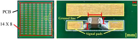 To observe changes in impedance spectra resulting from cracks in components, SMD capacitors were selected as the test subjects. Although these components share identical package dimensions, their internal structures and electrical operating characteristics may lead to varying responses to cracks, making them suitable for a comparative analysis of impedance characteristics during crack propagation. Additionally, the solder joints of the capacitors were formed using SAC305 alloy, which is a widely adopted lead-free solder (96.5% Sn, 3% Ag, and 0.5% Cu) in commercial electronic packaging processes. For the experiment, capacitors (100 nF, CL21B104KCFNNNE) with dimensions of 2 mm × 1.25 mm × 1.35 mm were mounted on a 100 mm × 100 mm test PCB in a 14 × 8 array, as depicted in Figure 1. Subsequently, mechanical cracks were introduced to the components across 112 experimental specimens.