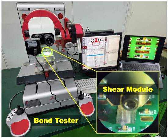 Mechanical damage was incrementally applied to the SMD capacitors to experimentally reproduce the crack initiation and propagation process. The cracks were introduced using a shear module attached to a bond tester (Condor Sigma, XYZTEC), as illustrated in Figure 2. The shear module, shown in Figure 3, is designed to apply horizontal shear forces to the side of the component, making it suitable for simulating mechanical stresses [21,35].