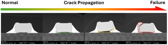 In the experiment, a displacement of 150 µm was repeatedly applied to the SMD capacitors to induce cracks step by step. Both the magnitude of displacement and the number of repetitions were controlled according to predefined criteria, and crack progression was divided into a total of nine stages. Each stage represented a different level of crack severity, with stage 0 indicating the normal state and stage 8 representing severe crack propagation, just prior to component failure. All specimens were uniformly arranged on identical boards and treated consistently before and after crack application and impedance spectrum measurement to ensure the reliability of the collected data. The presence and severity of cracks were confirmed through scanning electron microscopy (SEM), as shown in Figure 4. SEM images clearly demonstrated crack formation on the surface and within the interior of the capacitors, which was found to be consistent with the typical crack patterns observed in SMD capacitors [27].