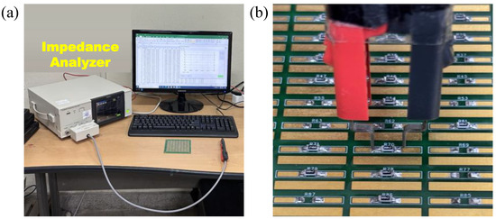 To non-destructively diagnose the condition of SMD capacitors subjected to progressive crack levels, impedance spectra were measured for each specimen. Impedance spectroscopy serves as an effective diagnostic tool by analyzing the electrical responses of components across various frequency ranges, enabling the assessment of electrical property changes caused by cracks in the components. In this experiment, data were collected using an impedance analyzer (IM3570, HIOKI, Nagano, Japan). The measurement frequency range of the impedance analyzer was set from 5 kHz to 5 MHz, which was divided uniformly into 801 data points across the frequency interval. As illustrated in Figure 5, the measurements were conducted by directly contacting probes to both solder joints of the passive SMD capacitor.