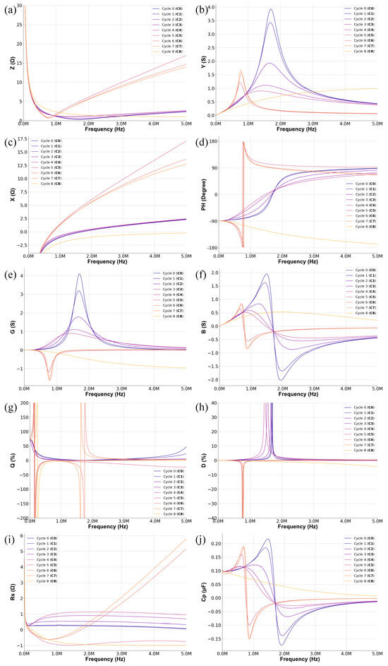 Variations in frequency-domain impedance spectra of capacitors at different crack levels: (a) Z, (b) Y, (c) X, (d) , (e) G, (f) B, (g) Q, (h) D, (i) Rs, (j) Cp.