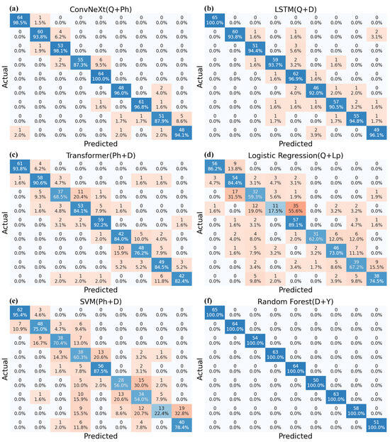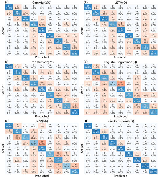 Comparsion of diagnostic performance for crack severity classification using machine learning models: (a) ConvNeXt with Q, (b) LSTM with Q, (c) Transformer with , (d) Logistic Regression with Q, (e) SVM with , (f) Random Forest with D.