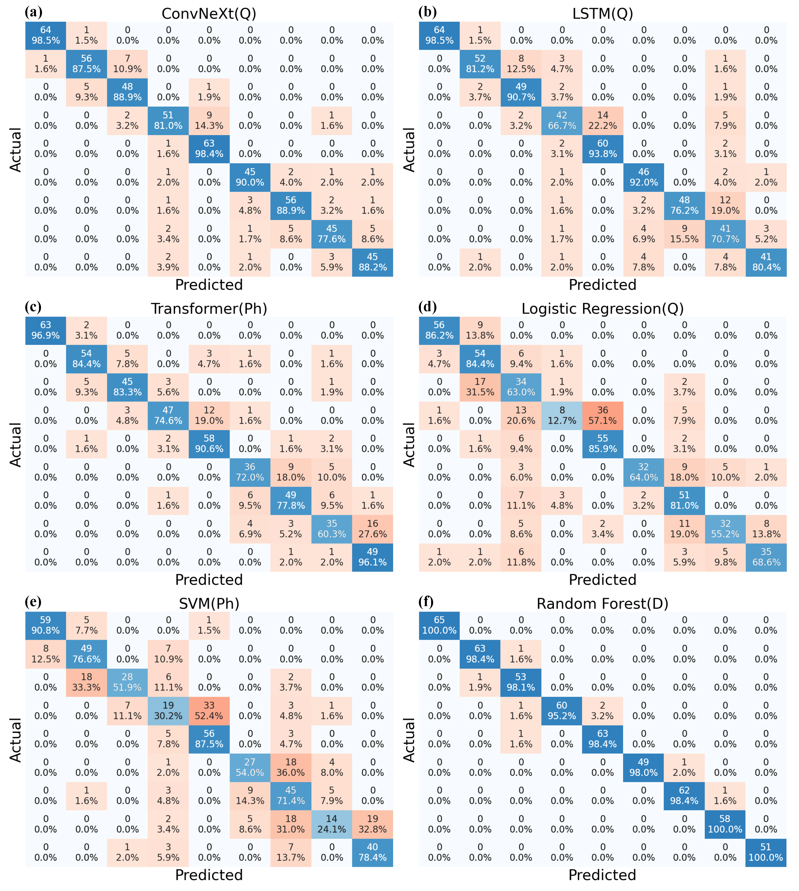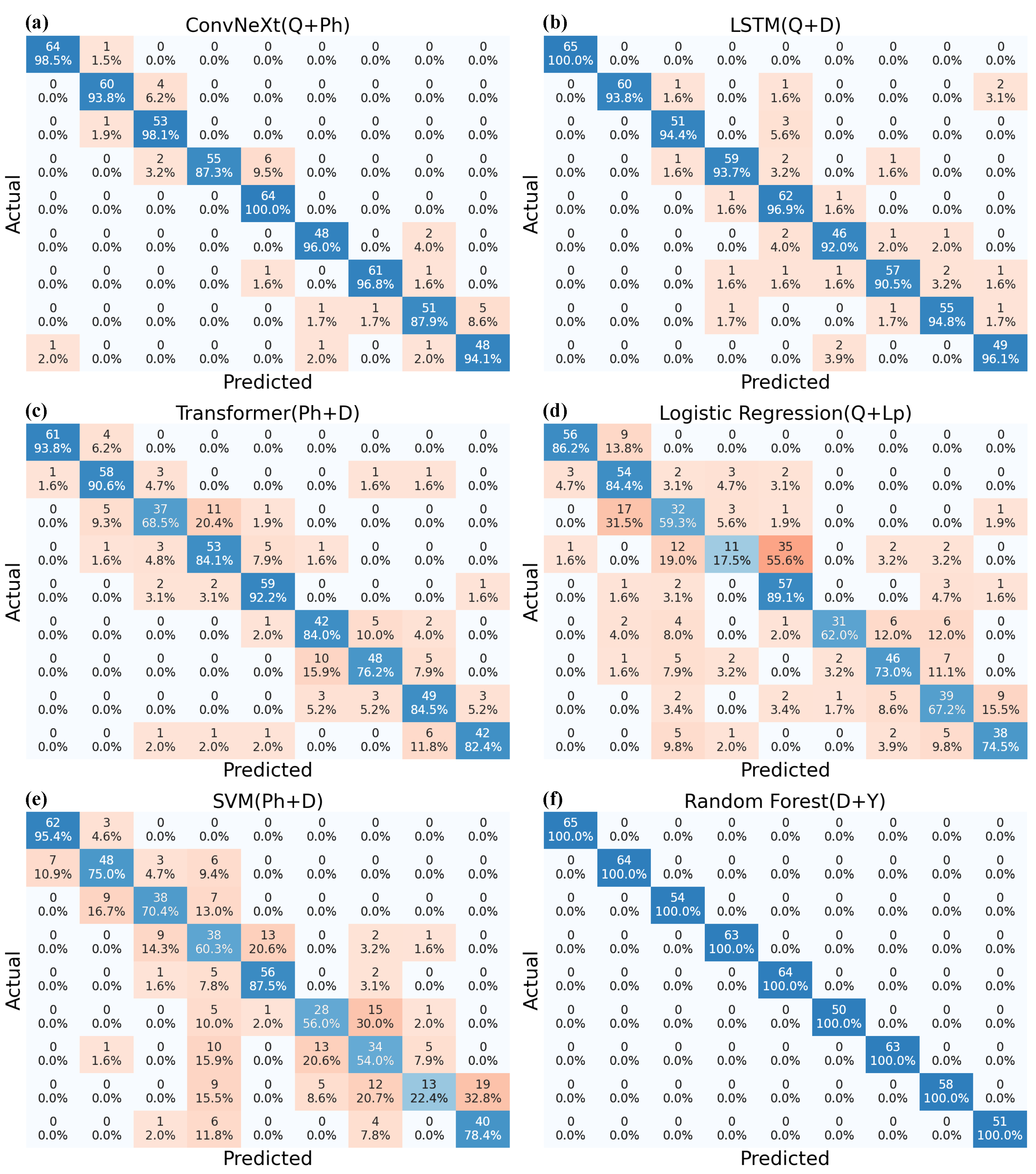 When summarizing the results of parameter combinations, Random Forest demonstrated the highest performance, achieving 100% accuracy across all combinations when D served as the baseline parameter. Following this, ConvNeXt with the Q + D combination achieved 97.0%, while LSTM with Q + D reached 94.7%. The Transformer with + D obtained 84.4%, Logistic Regression with Q + D achieved 71.4%, and SVM with + D attained 67.1%. Overall, the addition of D consistently produced the strongest improvements across models, underscoring its role as a highly discriminative parameter.