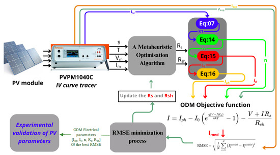 The optimization process minimizes the RMSE cost function, which quantifies the difference between the experimental current values and the currents predicted by the model. This closed-loop optimization continually refines the ODM parameters until the RMSE is minimized, resulting in an optimal set of parameters that most accurately reflects the physical behavior of the PV module under the given test conditions.