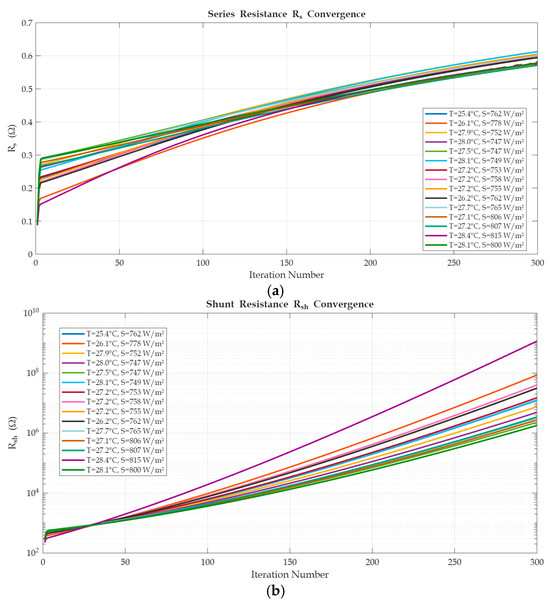 Various strategies have been proposed to address these issues. One common approach involves simplifying the model by either neglecting a parameter, typically or , or by assuming a fixed value for [3,4]. While such assumptions ease computation, they undermine model adaptability and accuracy across different PV technologies because parameter values vary significantly among module types. Other researchers have explored numerical and semi-analytical techniques. Some methods employ the Lambert W function to transform nonlinear equations into a form that enables parameter estimation [5]. However, these solutions often rely on specialized software and may introduce approximation errors. Alternative approaches employ the Lambert W-function to transform the transcendental one-diode equation into semi-explicit forms, enabling direct calculation of current for given voltage and parameters [6]. Recent work by Abbassi et al. [7] demonstrated accurate parameter extraction using Lambert W-functions in combination with the Puma optimization algorithm, achieving competitive results across various PV technologies. However, these methods typically optimize all five parameters simultaneously and still require numerical evaluation of the special Lambert W-function itself (usually via iterative Newton-Raphson methods). Moreover, the computational complexity remains where represents the full parameter dimensionality. Our hybrid approach achieves comparable accuracy with reduced computational burden by restricting metaheuristic search to a two-dimensional resistance subspace (), while deriving the remaining parameters () through closed-form analytical expressions that exploit physical boundary conditions.