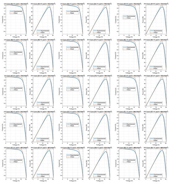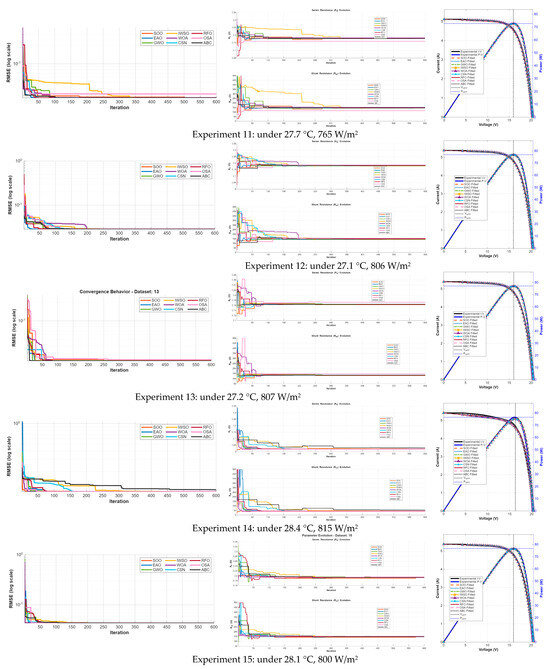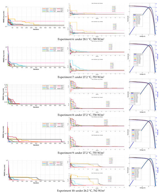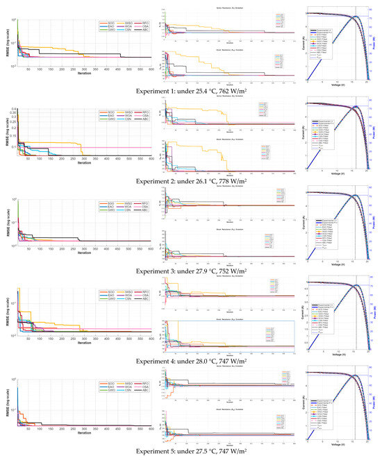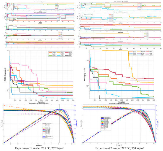 Looking at the individual parameter estimates, we can see that the algorithms perform similarly in terms of , , and n, with the estimations remaining fairly close to the experimental values across all methods. For example, the Rs values for most algorithms are in the range of 0.1–0.2 Ω, whereas values range from approximately 40 to 160 Ω. n was generally close to 60, with small deviations from the ideal value. and , which are critical for the accuracy of the PV model, show minor variations, with values typically of the order of 10−6 A and values of approximately 5 A. Despite the slight variation in estimations, the algorithms provide reasonable estimates that are consistent with the experimental data.