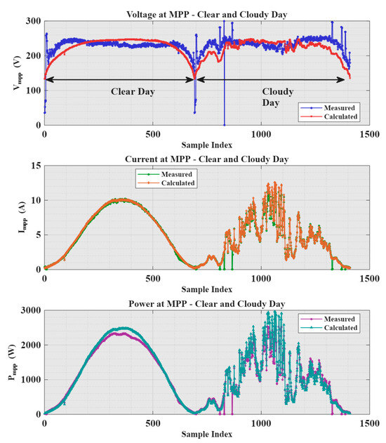 A comprehensive three-panel analysis of 1386 measured and calculated PV parameters across clear-sky and cloudy conditions validates the hybrid analytical-metaheuristic parameter extraction method across diverse atmospheric scenarios (see Figure 12). During clear-sky operation (samples 1–693), the method exhibits exceptional accuracy for voltage tracking ( 220–240 V with minimal deviation), photocurrent extraction (: monotonic increase from 0 A at sunrise to A at solar noon, then symmetric decline toward sunset), and power output prediction (: smooth Gaussian profile peaking at approximately 2400 W with ), with measured and calculated parameters exhibiting near-perfect superposition across all three panels. This exceptional steady-state performance (voltage ) reflects the method’s ability to accurately capture the characteristic physics of silicon photocell operation and the predictable diurnal variation in extraterrestrial radiation modulated by atmospheric optical depth and solar elevation angle. Under cloudy conditions (samples 694–1386), the voltage spans a substantially wider dynamic range (50–280 V) compared to clear-sky conditions, while photocurrent oscillates across 0–12 A and power output varies between 500 and 2500 W.